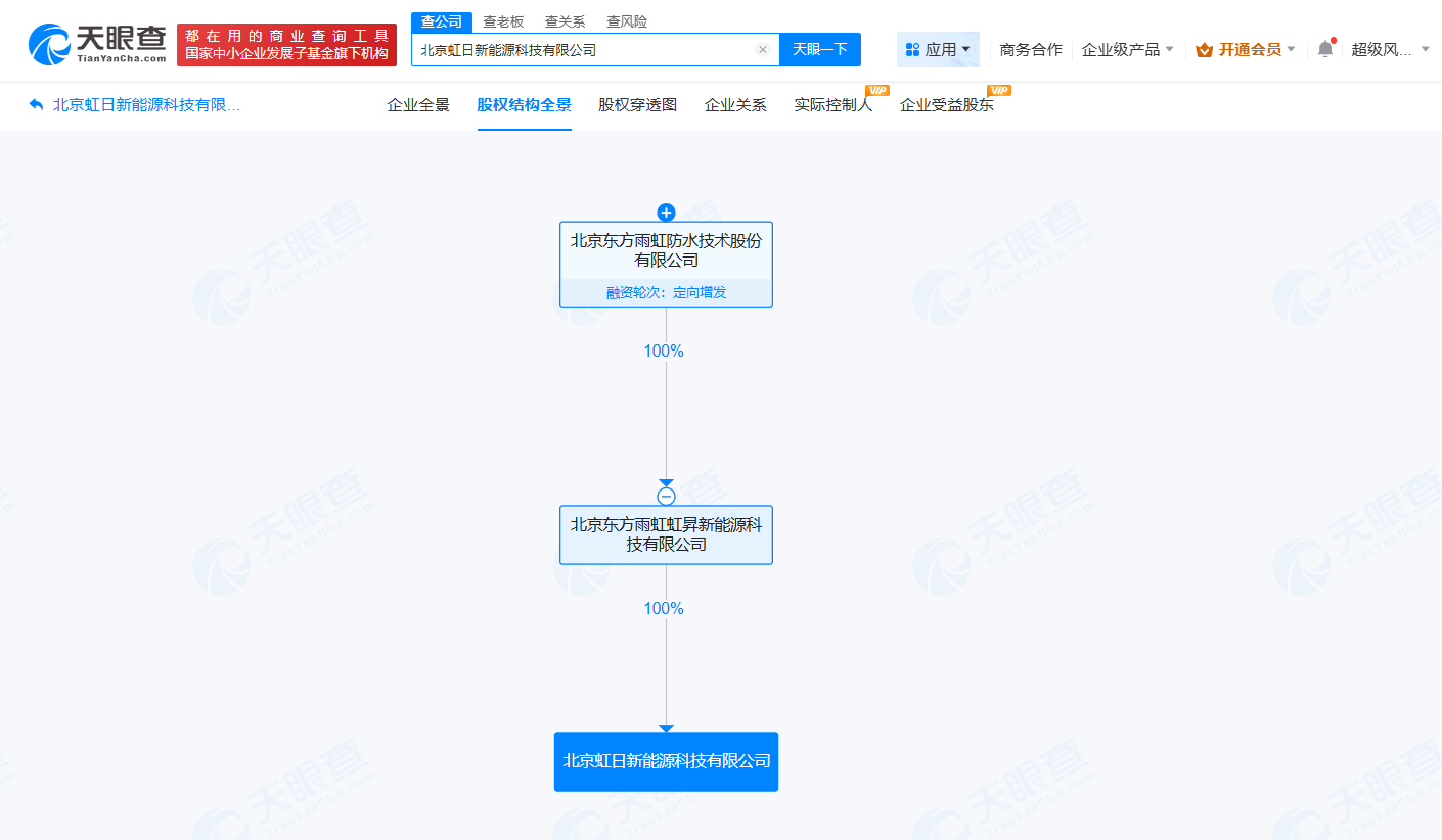 天眼查工商信息显示,近日,北京虹日新能源科技有限公司成立,法定代表人为王璐,注册资本15万人民币,经营范围包括太阳能发电技术服务、工程管理服务、新能源原动设备销售、新兴能源技术研发等。股权全景穿透图显示,该公司由东方雨虹(002271)旗下北京东方雨虹虹昇新能源科技有限公司全资持股。