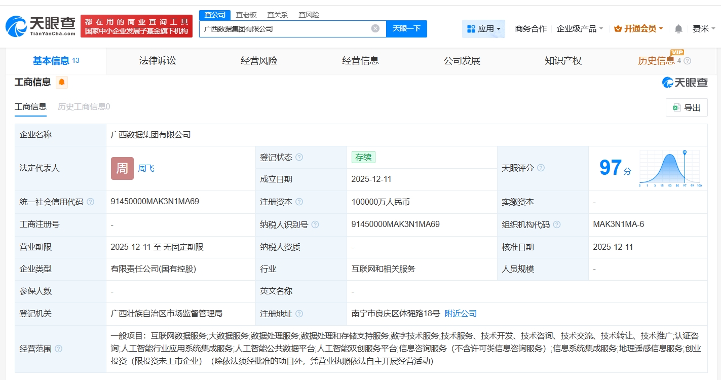 天眼查App显示,近日,广西数据集团有限公司成立,法定代表人为周飞,注册资本10亿人民币,经营范围包括互联网数据服务、大数据服务、数据处理服务、数据处理和存储支持服务等,由广西壮族自治区人民政府国有资产监督管理委员会、广西投资集团有限公司、广西国控资本运营集团有限责任公司、广西北部湾投资集团有限公司共同持股。