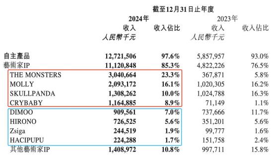 近年,THE MONSTERS(以LABUBU为主)成为了收入占比最高的IP;Crybaby则是增长速度最快的新锐IP,去年下半年收入同比暴增15倍以上;Hirono小野、Zsiga等新锐IP也不断破圈,如今泡泡玛特累计已有13个IP实现营收破亿元。