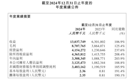 如今看来,泡泡玛特用业绩回应了外界的质疑,其在近日交出了一份“史上最强”的业绩报告:2024年实现营收130.4亿元,同比增长106.9%;经调整净利润34.0亿元,同比增长185.9%。