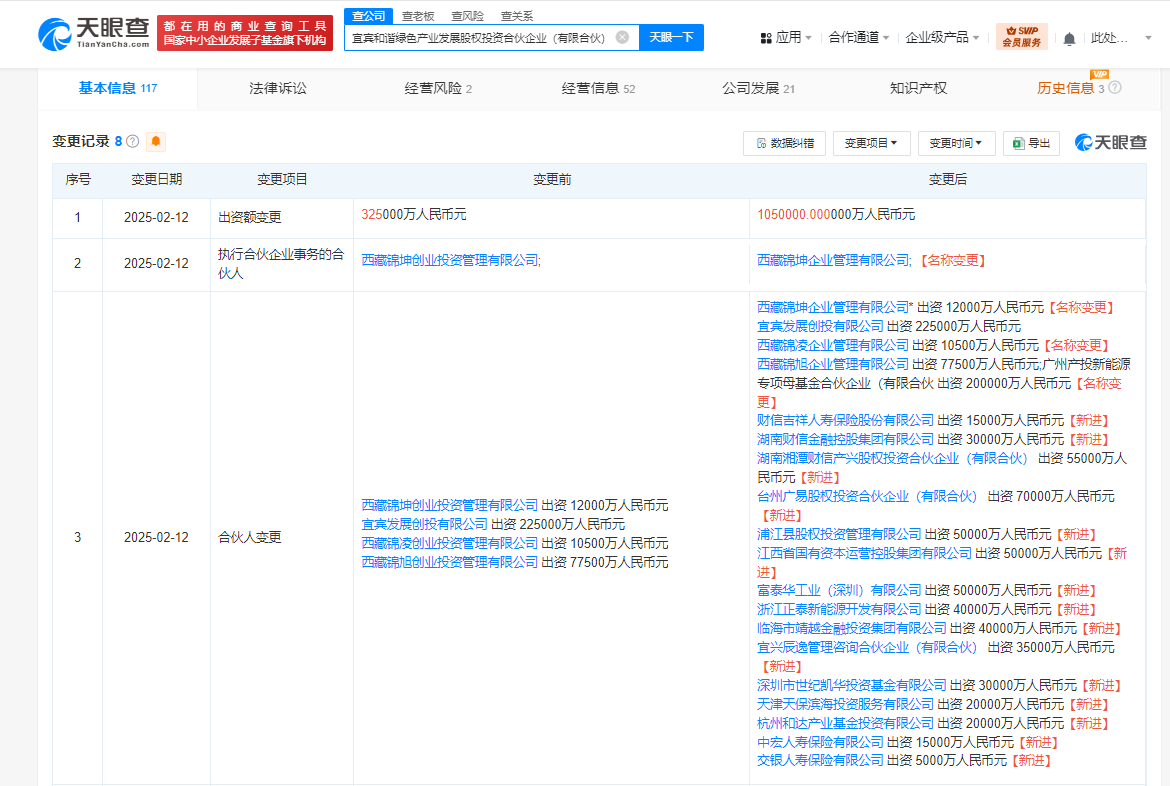 天眼查App显示,近日,宜宾和谐绿色产业发展股权投资合伙企业(有限合伙)发生工商变更,新增交银人寿保险有限公司、富士康旗下富泰华工业(深圳)有限公司、财信吉祥人寿保险股份有限公司等为合伙人,同时,该合伙企业出资额由32.5亿人民币增至105亿人民币。