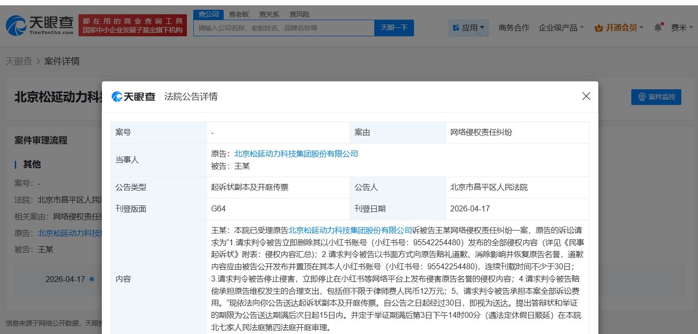 天眼查App显示,近日,北京市昌平区人民法院向王某公告送达原告北京松延动力科技集团股份有限公司与被告王某网络侵权责任纠纷一案起诉状副本及开庭传票,自本公告之日起经过三十日即视为送达。该案将定于举证期满后第三日公开开庭审理。