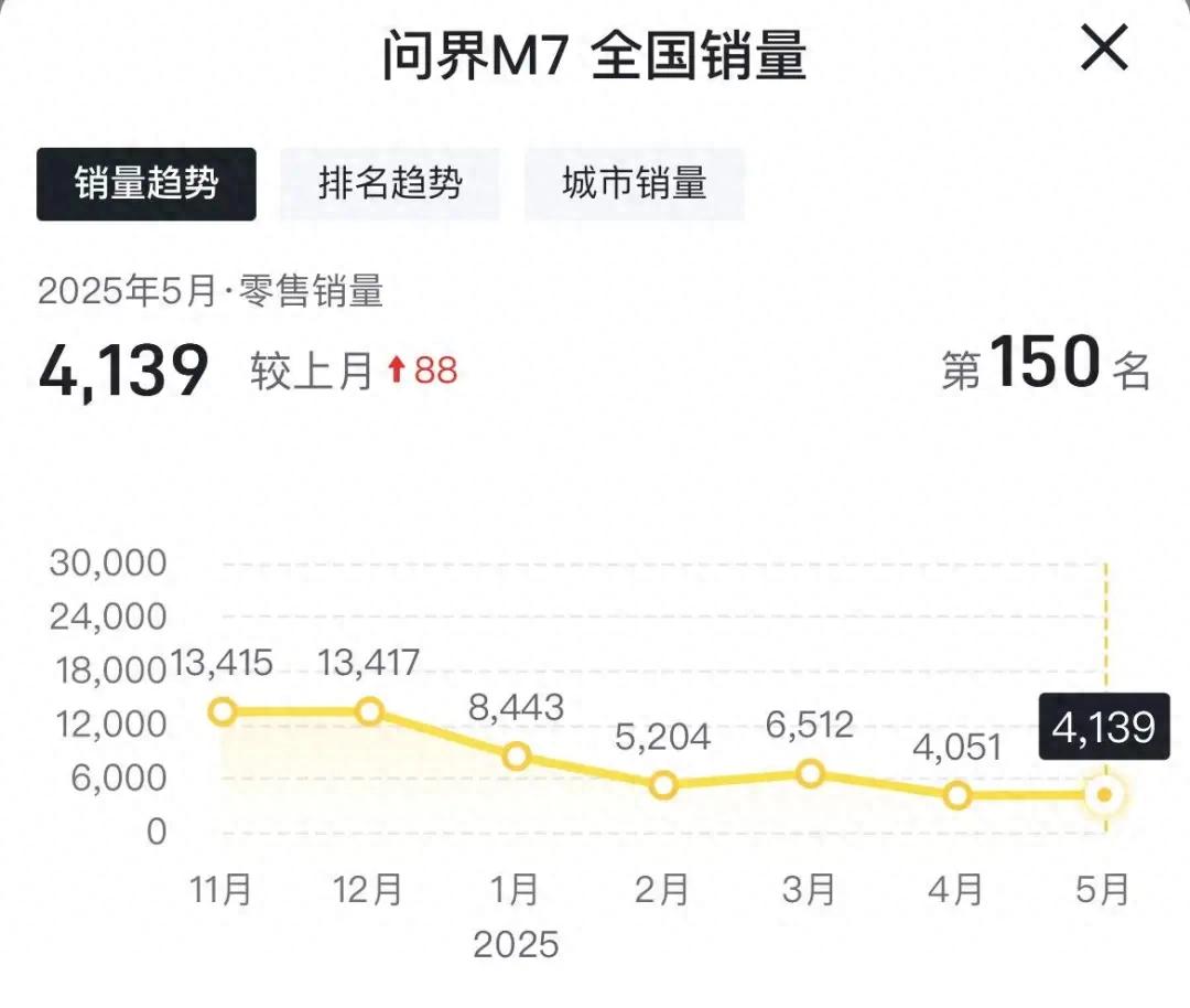 从销量曲线来看,问界 M7 的下滑轨迹清晰且刺眼:2025 年 1 月仍保持着超 8000 辆的水平,但 1-5 月连续走低,4-5 月直接跌破 5000 辆关口,5 月销量仅为 4139 辆。这样的表现不仅与巅峰时期相去甚远,更让市场大跌眼镜。