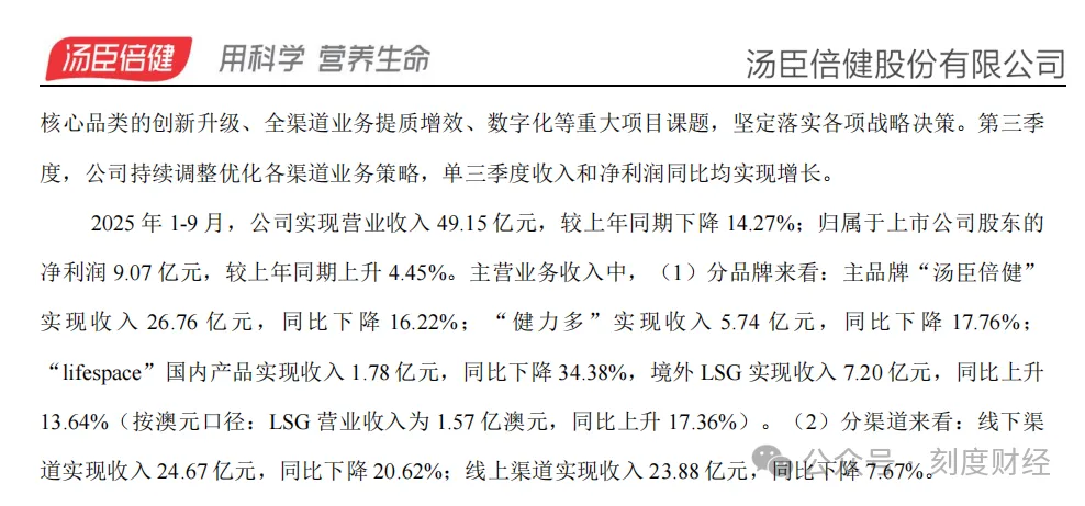 数据显示,2025年1-9月,汤臣倍健实现营业收入49.15亿元,较上年同期下降14.27%。