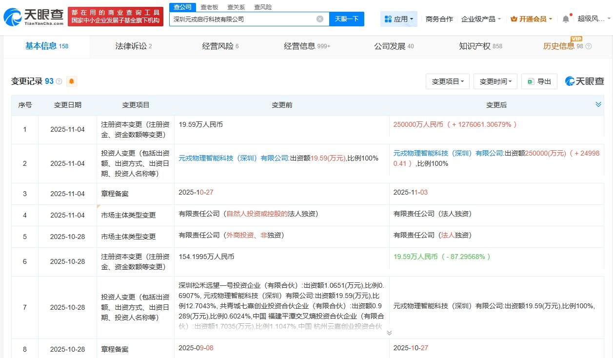 天眼查工商信息显示,近日,深圳元戎启行科技有限公司发生工商变更,注册资本由19.59万人民币增至25亿人民币,增幅约1276061%。