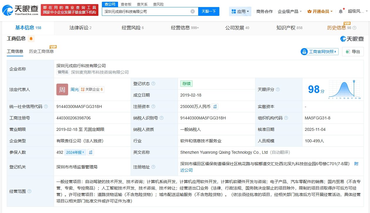 该公司成立于2019年2月,法定代表人为周光,经营范围包括自动驾驶的技术开发、人工智能技术开发、计算机应用软件开发等。股东信息显示,该公司由元戎物理智能科技(深圳)有限公司全资持股。公开信息显示,元戎启行是一家辅助驾驶系统研发商。