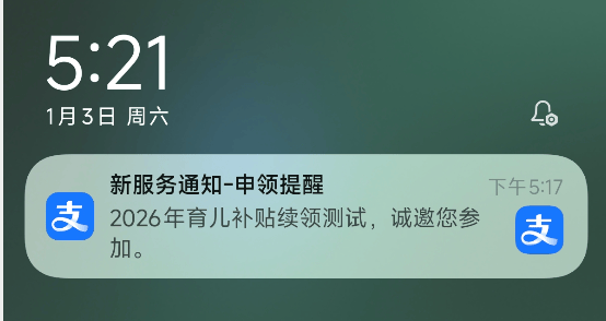 1月4日消息,2026年育儿补贴系统正在进行续领测试,已有人收到支付宝的邀约并完成申领。
