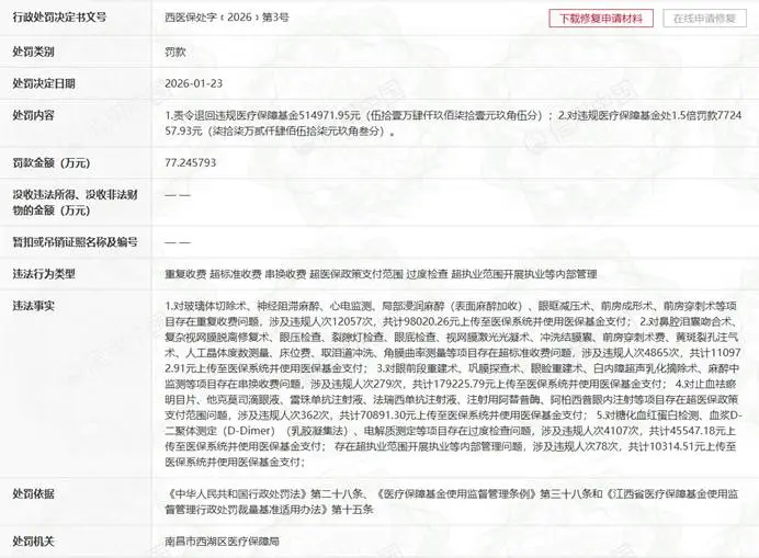 近日,南昌爱尔眼科医院因违规使用医保基金被南昌市西湖区医疗保障局处罚:责令退还违规使用的514971.95元医保基金,并处以772457.93元的1.5倍罚款,合计约130万元。该处罚决定书所揭示的违规行为十分严重,该院存在重复收费、超标准收费、串换收费、超出医保支付范围、过度检查以及超出执业范围等六类问题,总共违规次数达到21748次。