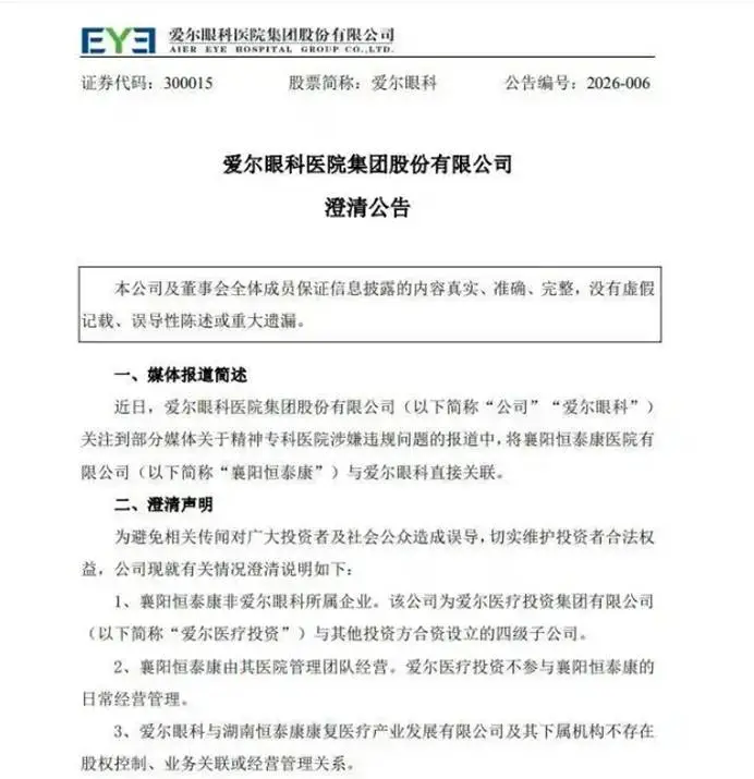 澄清一:襄阳恒泰康医院的股权关系。爱尔眼科表示,该医院不属于上市公司体系内的公司,而是由爱尔医疗投资集团与其它资本共同出资设立的四级子公司,不列入上市公司合并报表范围。