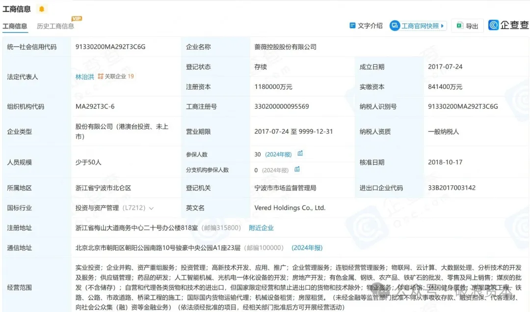 蔷薇控股工商信息(来源:企查查)