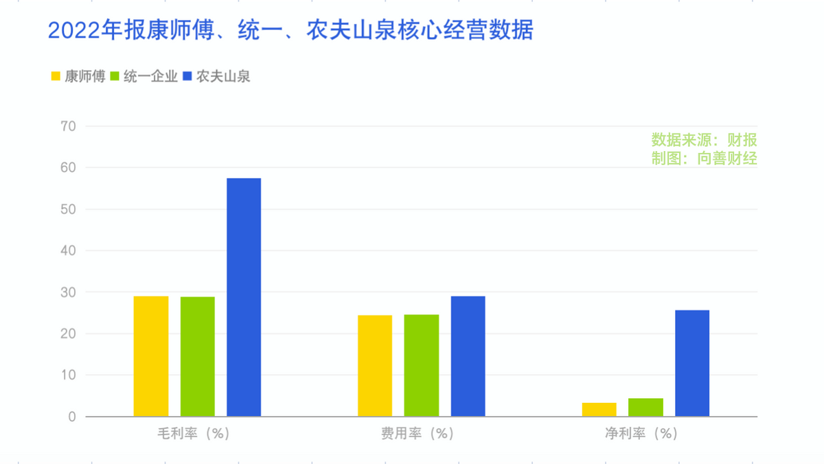 一般来说,消费领域推出新品牌,或者冲击新的成长业务,是需要大量的营销费用去做市场品牌的,但在消费企业中,康师傅的费用率其实并不算高。以2022年的财报数据来看,康师傅的营业费用率为24.4%,农夫山泉为29.05%,统一企业为24.54%。