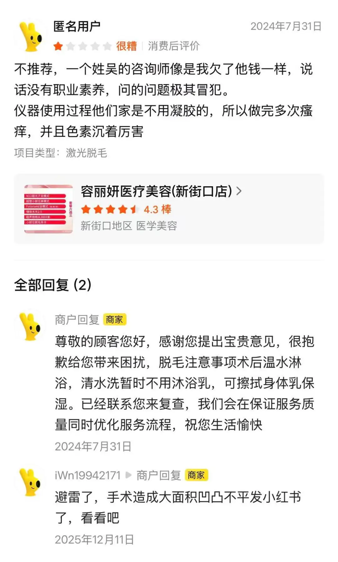 有消费者吐槽,南京容丽妍的咨询师全程“欠钱脸”,用语冒犯、毫无职业素养。并且操作时为省成本不用耦合凝胶,导致术后多次瘙痒、色素沉着严重,还出现大面积凹凸不平,让人非常寒心。