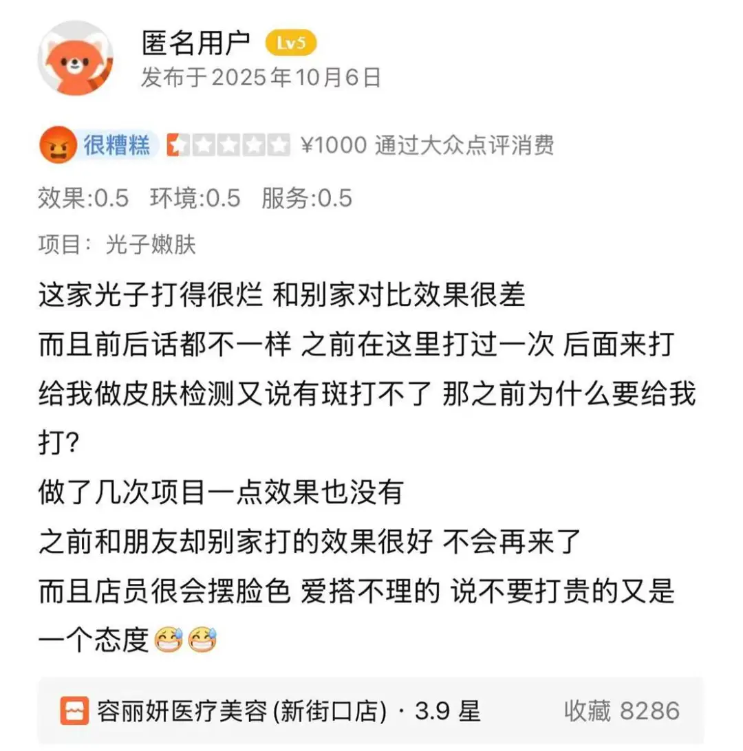 更无语的是,工作人员态度随消费金额而变,顾客一表示“不打贵的”立即遭冷眼相待,被批“摆脸色、爱搭不理”,折射出南京容丽妍项目评估随意、效果欠佳和服务歧视等多重问题。