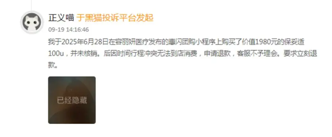 2025年6月28日,消费者在团购小程序上,花费1980元在购入保妥适100U,后因行程冲突申请退款,南京容丽妍的客服却全程已读不回,平台也无退款入口,形成“钱扣了、针没打、款不退”的僵局。