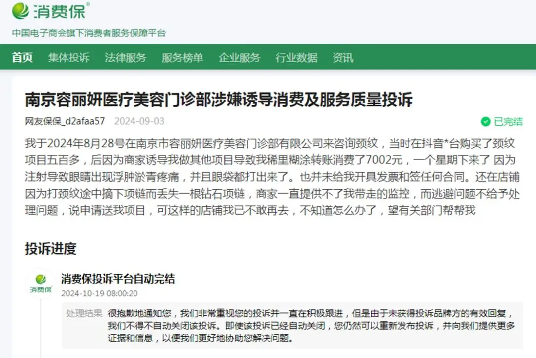 2024年8月28日,消费者前往南京容丽妍咨询颈纹,在抖音平台仅花五百多元购买该项目,却被店员话术诱导,现场稀里糊涂追加转账7002元做其他注射。