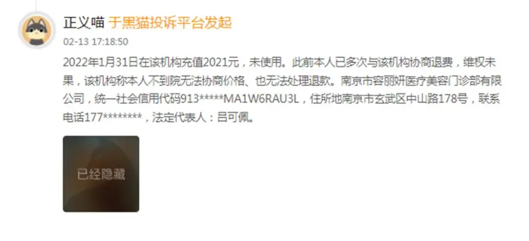 另有消费者爆料,2022年1月31日在南京容丽妍充值2021元后一直未消费,两年多来多次要求退款均被以“不到院无法协商价格、不能办理退款”为由推诿,至今分文未退。