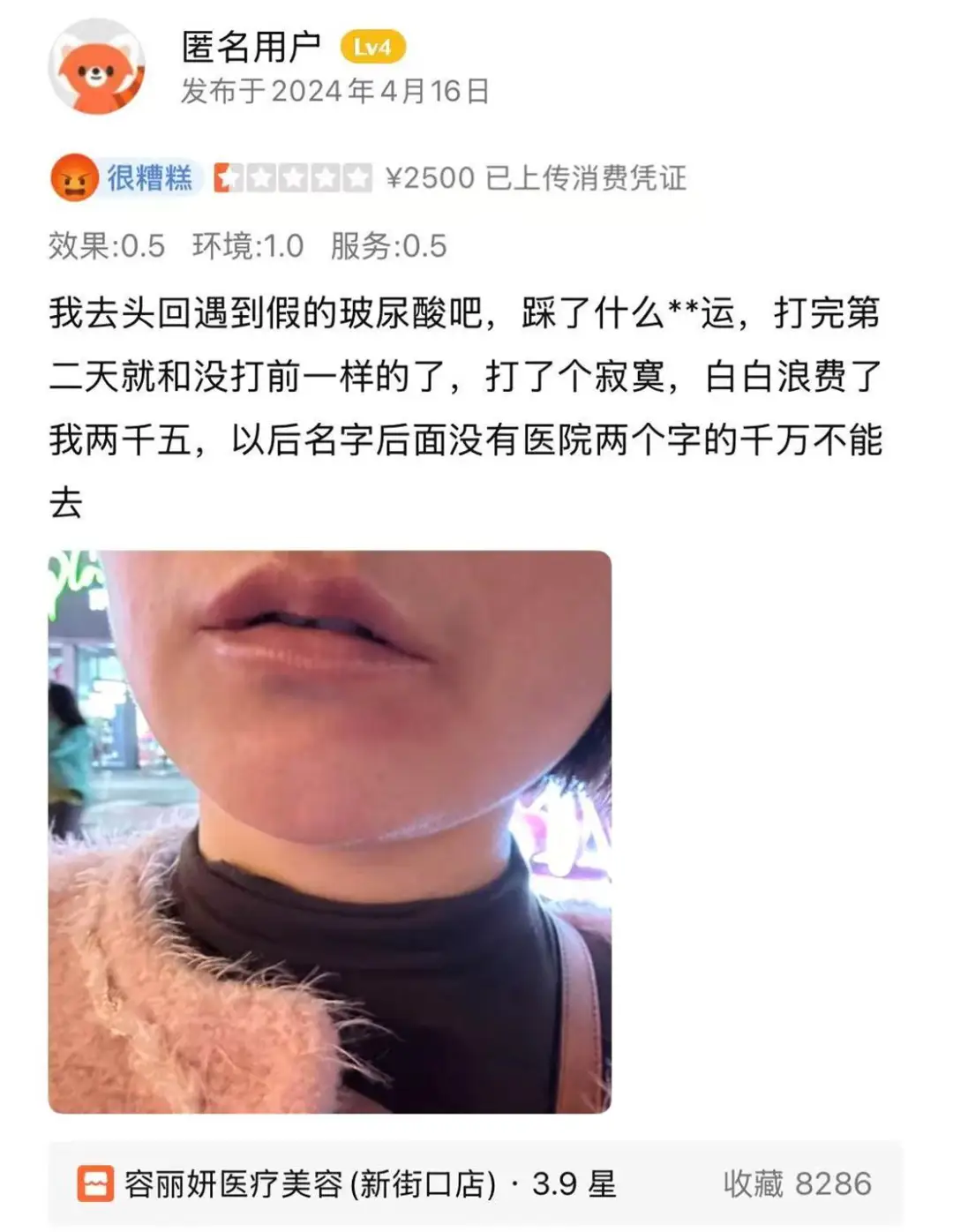 还有消费者质疑南京容丽妍使用“假玻尿酸”,花了2500元注射,次日即恢复原状,毫无填充效果,自嘲“打了个寂寞”。并警示“以后名字后面不带医院两字的千万不能去”,直指机构产品来源可疑、疗效虚空,涉嫌欺诈消费。