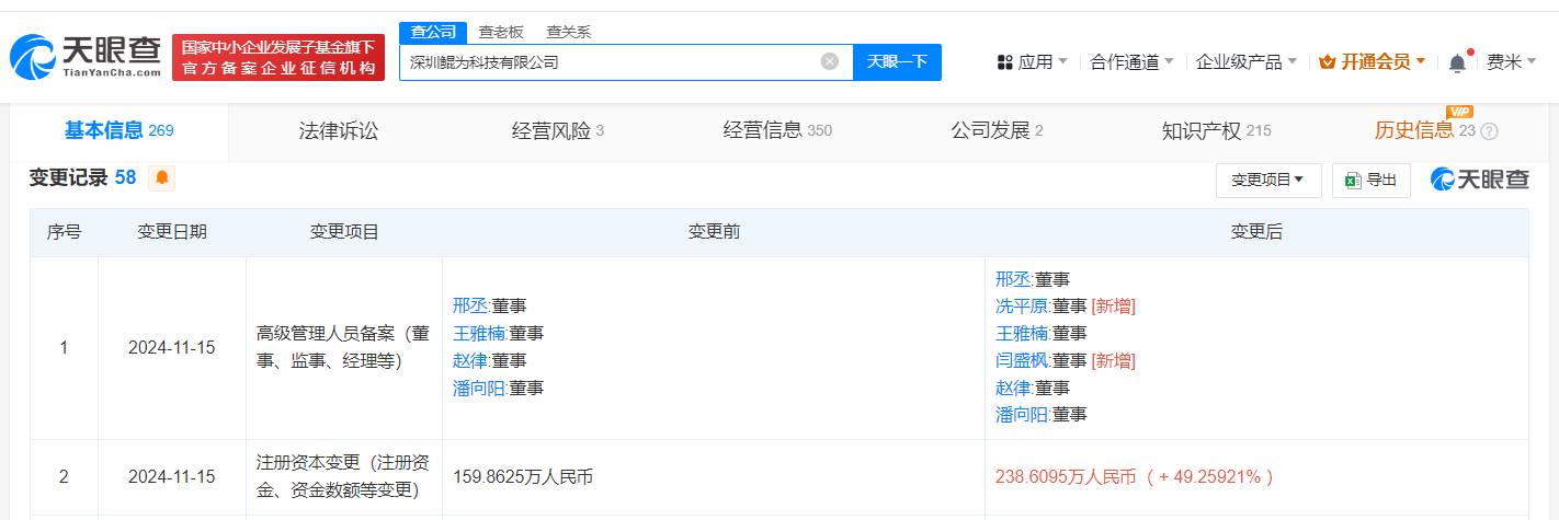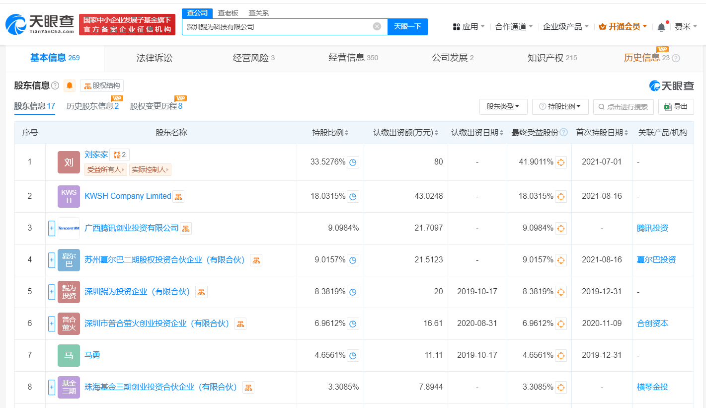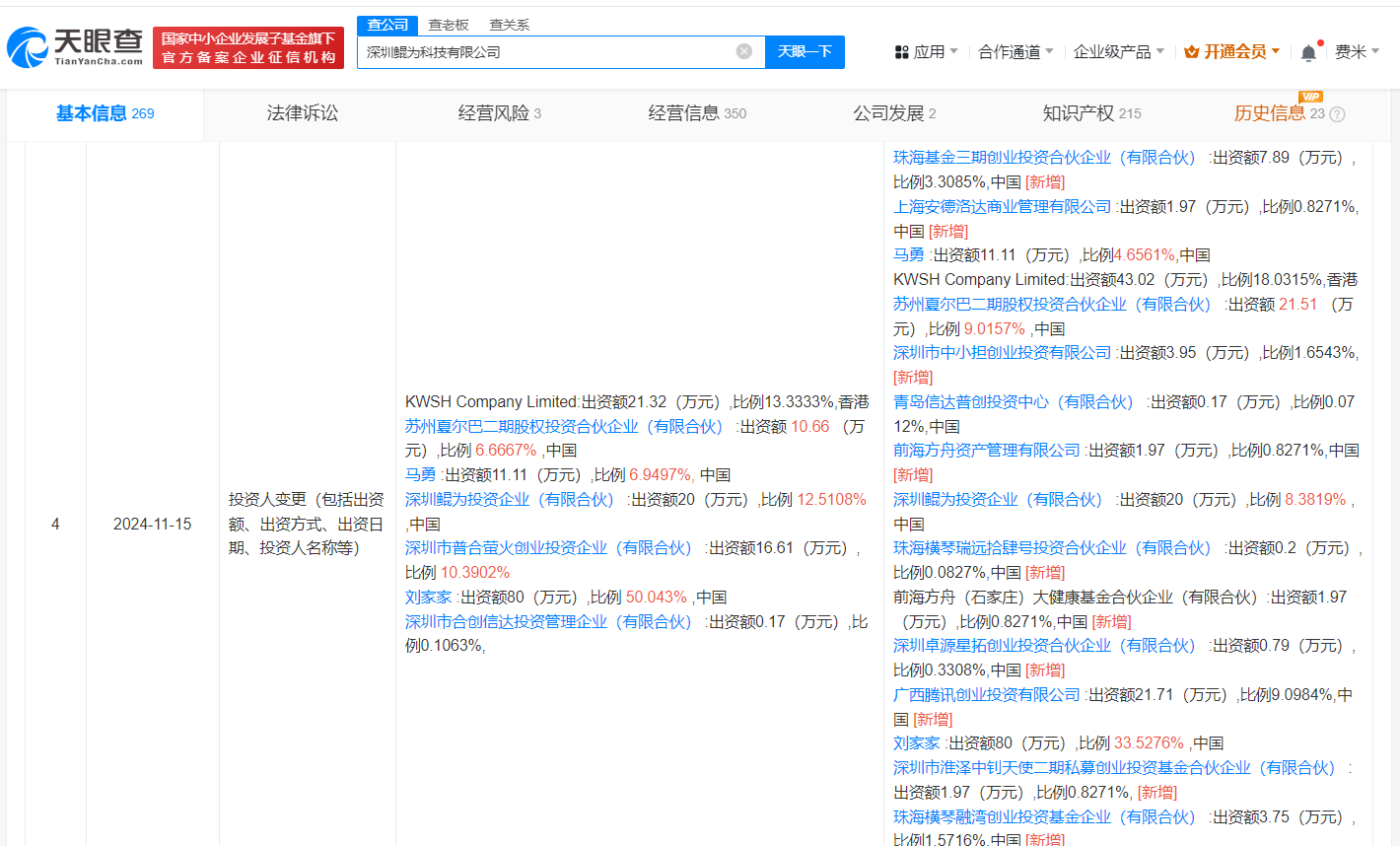 天眼查App显示,近日,深圳鲲为科技有限公司发生工商变更,股东新增广西腾讯创业投资有限公司、珠海基金三期创业投资合伙企业(有限合伙)、深圳市中小担创业投资有限公司等为股东,同时注册资本由约159.9万元人民币增至约238.6万元人民币。