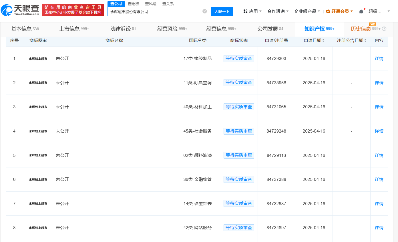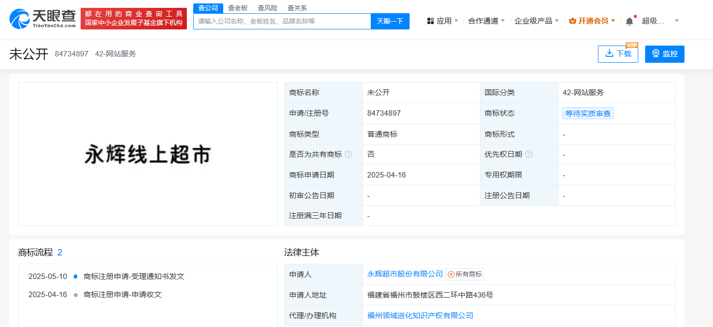天眼查财产线索信息显示,近日,永辉超市股份有限公司申请注册多枚“永辉线上超市”商标,国际分类涉及食品、广告销售、金融物管、网站服务等,当前商标状态均为等待实质审查。