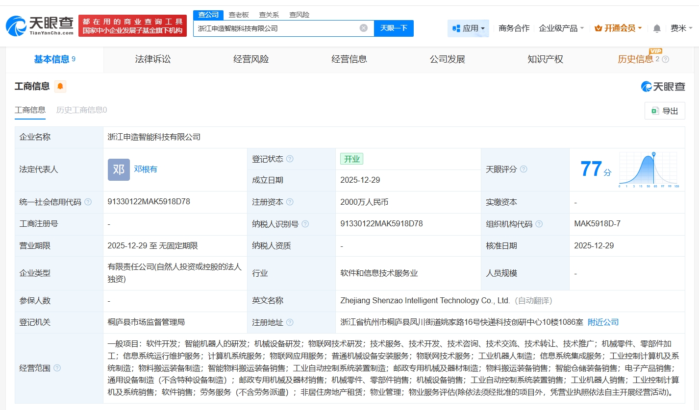 近日,浙江申造智能科技有限公司成立,法定代表人为邓根有,注册资本2000万人民币,经营范围包括智能机器人的研发、机械设备研发、物联网技术研发等,由申通快递有限公司全资持股。