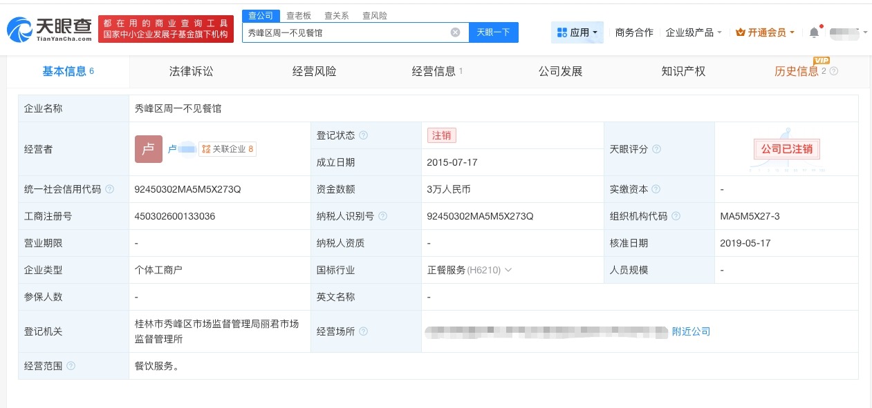 天眼查显示,“周一见”已被多方申请注册为商标,国际分类涉及方便食品、食品、啤酒饮料、教育娱乐等,当前部分商标状态为已注册。申请人包括厦门某餐饮管理有限公司、恩施某材料工程科技有限公司、广东某汽车科技有限公司等。另外,目前有多家公司名称中含“周一见”。值得一提的是,有餐馆以“周一不见”命名,目前该餐馆已注销。