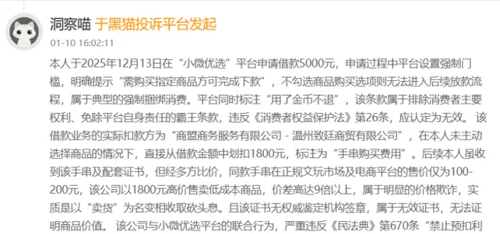 记者注意到,“贷款前需高价购物”是其另一投诉焦点。1月16日,一网友投诉称其于2025年12月13日在“小微优选”平台申请5000元借款时,平台设置强制门槛,提示“需购买指定商品方可完成下款”,若不勾选商品购买选项则无法进入后续放款流程。最终,在用户未主动选择商品的情况下,直接从借款金额中划扣1800元,标注为“手串购买费用”。后来,用户虽收到该手串及配套证书,但经多方比价发现,同款手串在正规文玩市场及电商平台的售价仅为100~200元。他认为这是以“卖货”为名变相收取“砍头息”。