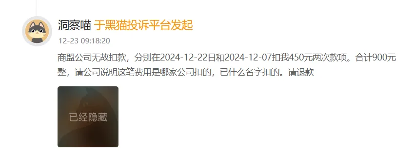 记者注意到,另有多名用户投诉商盟支付无故扣款。2025年12月23日,一网友投诉,遭遇商盟支付无故扣款2次,两次款项合计900元整。