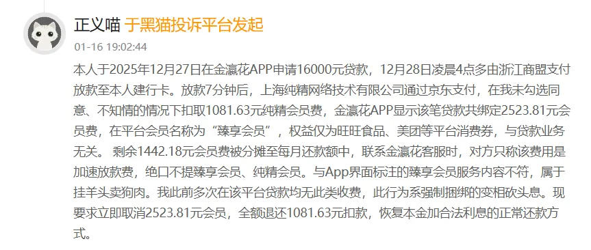 除居间服务费外,商盟支付还被投诉以收取会员费名义收高额息费。1月16日,一网友发帖投诉称,其于2025年12月27日在金瀛花APP申请16000元贷款,并于次日由商盟支付放款。放款7分钟后,即被扣除1081.63元会员费。金瀛花APP显示该笔贷款共绑定2523.81元会员费,但所提供的权益仅为旺旺食品、美团等平台消费券,与贷款业务无直接关联,而剩余的1442.18元会员费被分摊至每月还款额中。