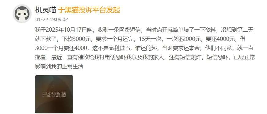 除强扣会员费、强制高价购物外,商盟支付还直接收取高额利息,若用户逾期则可能面临违规催收。1月22日,一网友投诉称,其于2025年10月17日晚贷款3000元,要求一个月还完,15天一次,一次还2000元,总计要还4000元。该网友质疑:“借款3000元,一个月需还款4000元,这难道不是高利贷吗?”他表示,当时曾要求仅偿还本金,但遭拒绝,对方一直拖延处理。近期,他频繁接到催收电话,并遭受短信轰炸,正常生活已受到严重影响。