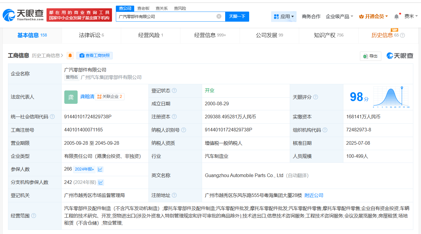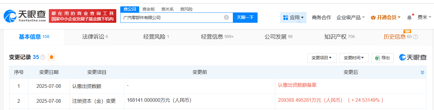 天眼查App显示,近日,广汽零部件有限公司发生工商变更,注册资本由约16.8亿人民币增至约20.9亿人民币,增幅约25%。