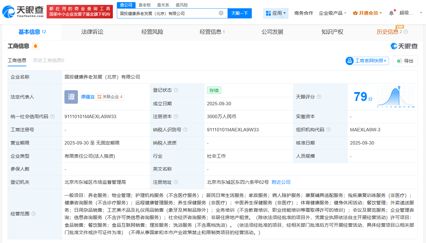 近日,国投健康养老发展(北京)有限公司成立,法定代表人为谭疆宜,注册资本3000万人民币,经营范围包括养老服务、物业管理、护理机构服务等,由国投健康产业投资有限公司全资持股。