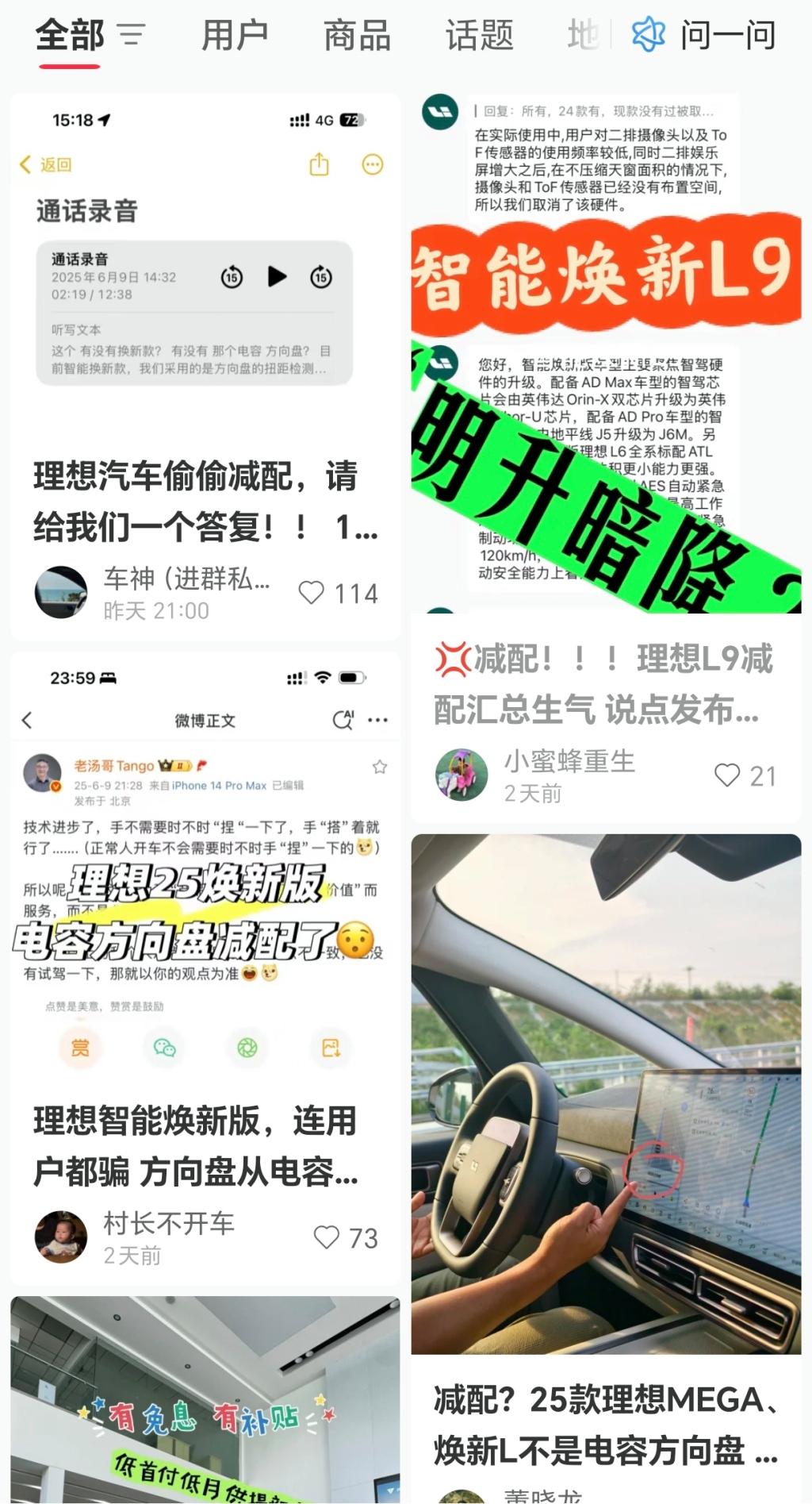 2020年,理想ONE作为理想汽车的首款车型,率先搭载握力感应方向盘,成为新势力中的标杆,如今却重新采用扭力感应方向盘,难免会让用户心理上产生落差,在舆论层面也遭受了不少抨击。在微博、小红书、抖音等社交平台记者发现,不乏大量车主的吐槽帖。