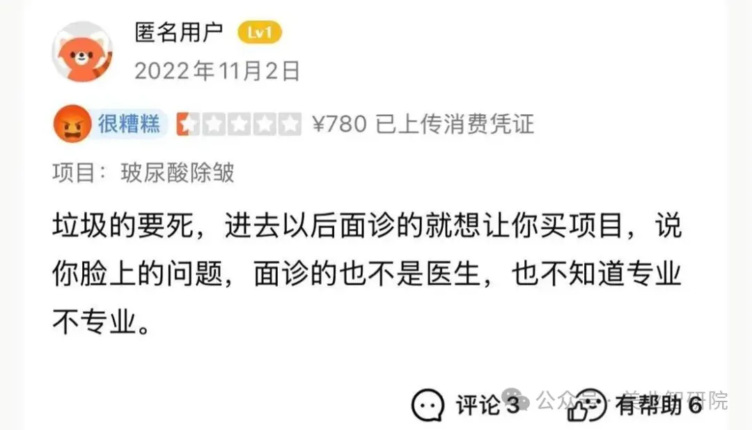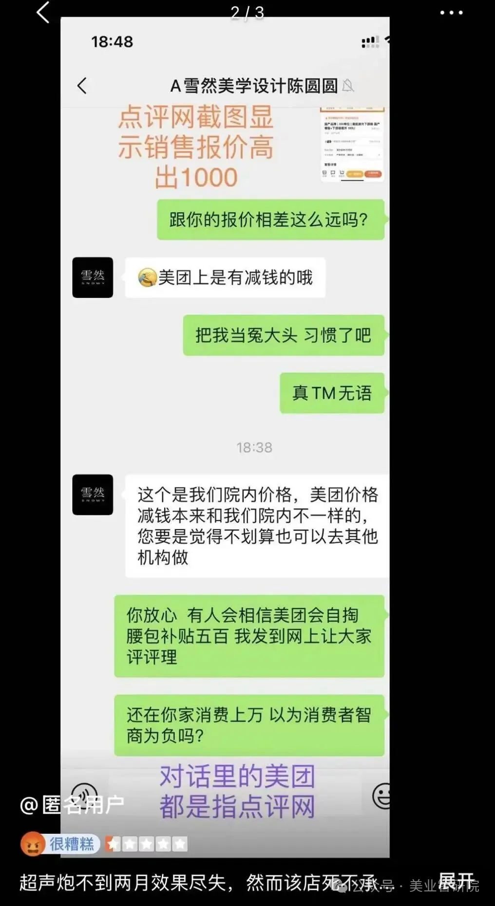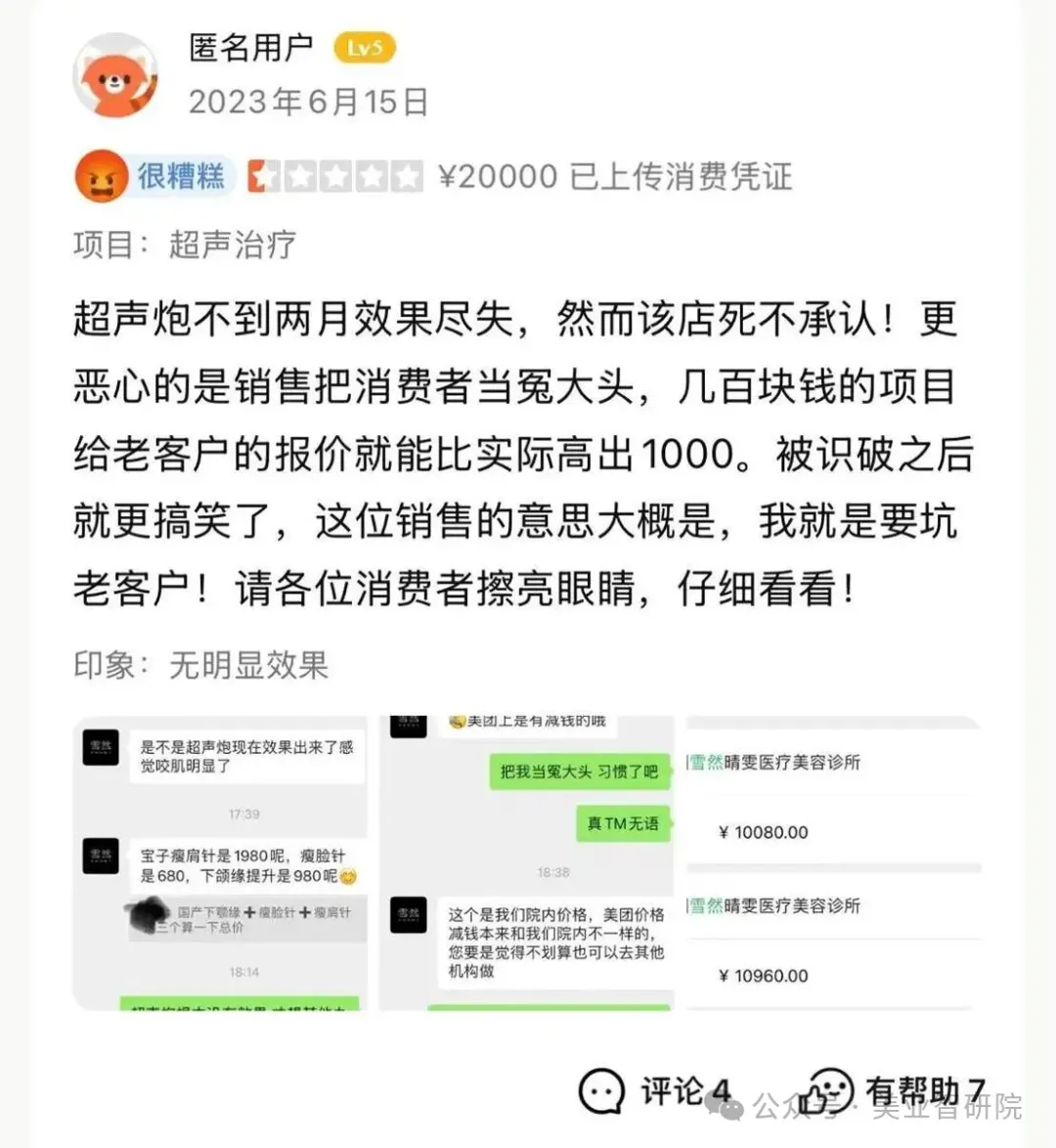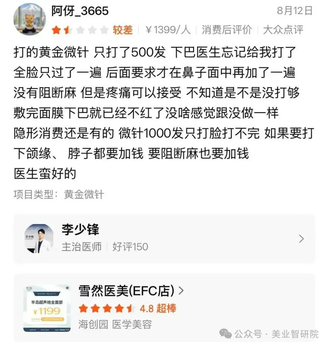 还有消费者在杭州雪然做黄金微针项目,医生漏打下巴仅全脸速扫500发,经提醒才补扫鼻周,术后下巴褪红极快、几乎无感,怀疑能量根本不足。关键机构事先未说明阻断麻药需另付费,若加下颌缘或脖子必须再补差价,隐形消费层层叠加,宣传时夸大治疗效果,实际体验却相差甚远,这让消费者对其信任度降至冰点。