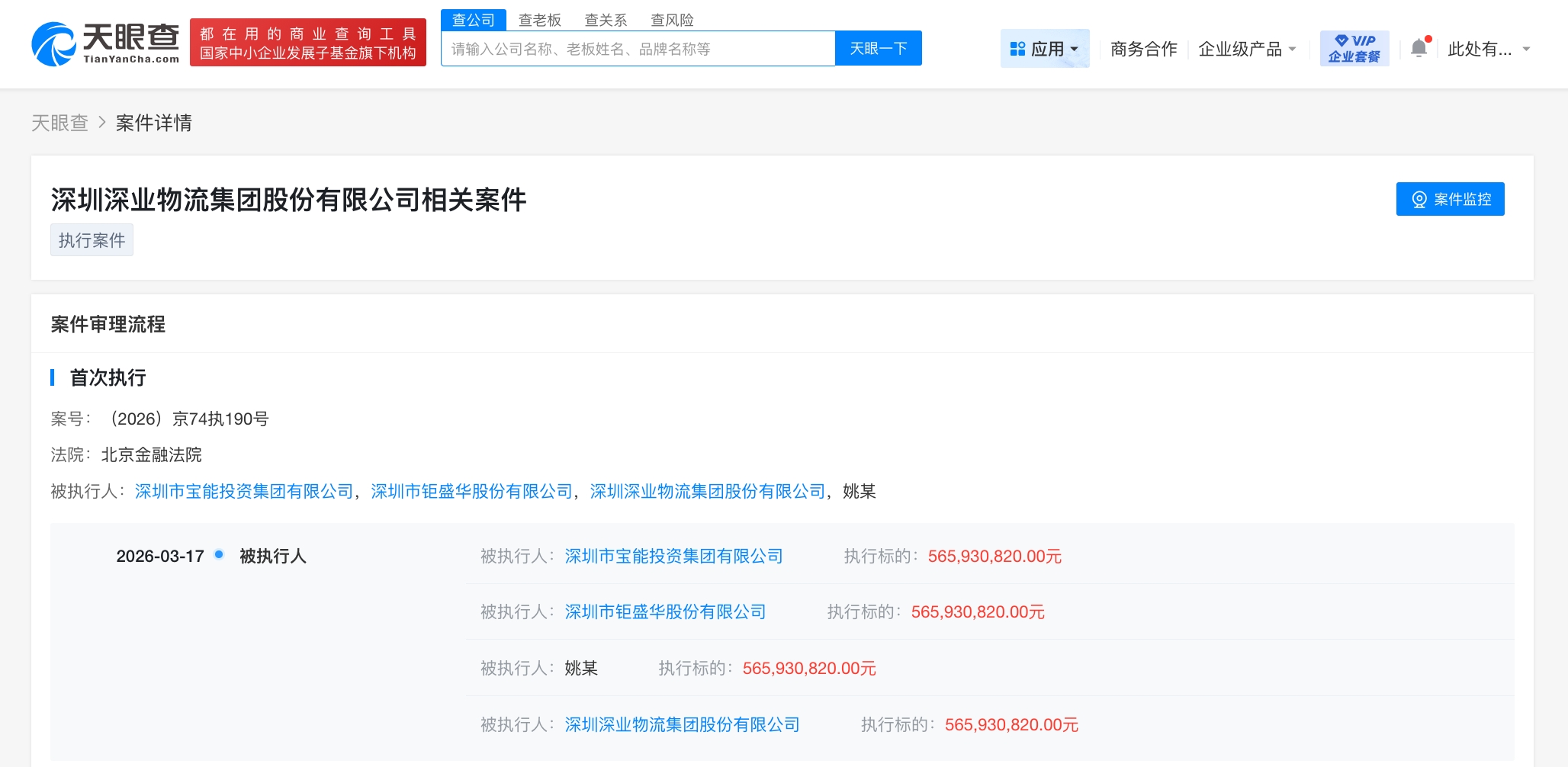 天眼查法律诉讼信息显示,近日,姚振华、深圳市宝能投资集团有限公司、深圳深业物流集团股份有限公司等新增一条被执行人信息,执行标的5.6亿余元,执行法院为北京金融法院。