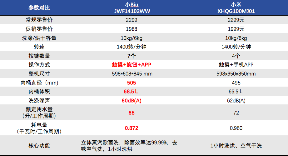 苏宁极物小Biu蒸汽洗烘一体机与米家互联网洗烘一体机参数对比
