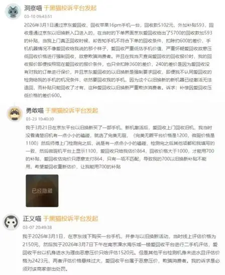 其次,还有大量投诉集中于平台存在“到手刀”的现象。所谓的“到手刀”,是指平台在线上给出极具吸引力的预估高价,待用户寄出或到店后,平台再以划痕、功能瑕疵等各种理由,大幅压低最终回收价。