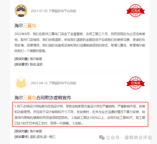 在投诉平台上,有消费者投诉三翼鸟“将不合格设计师包装为优选设计师,导致定制家居方案设计存在严重缺陷”、“由于设计缺陷和尺寸不符,在安装时,在未与业主沟通的情况下暴力安装,给房间内原有的墙面和吊顶造成明显损伤”、“合同约定工期80天,现工期已达180天仍未完工交付”等服务问题。这些侧面反映出三翼鸟在家装服务端有所欠缺。