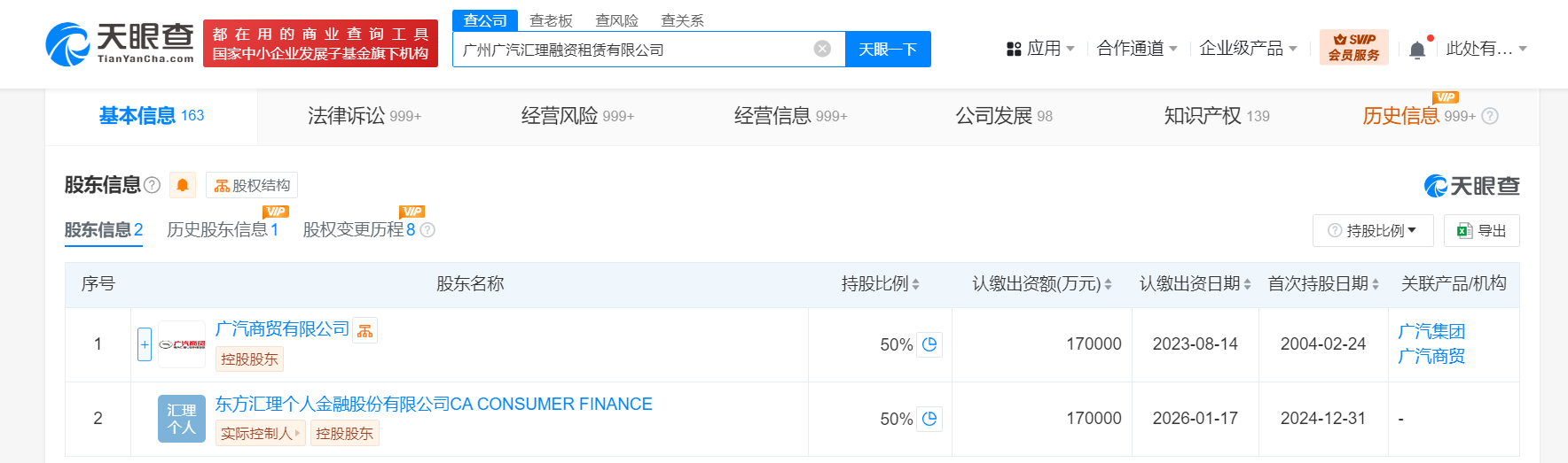 近日,广州广汽融资租赁有限公司发生工商变更,企业名称变更为广州广汽汇理融资租赁有限公司,新增东方汇理个人金融股份有限公司CA CONSUMER FINANCE为股东,注册资本由17亿人民币增至34亿人民币,同时,部分主要人员也发生变更。