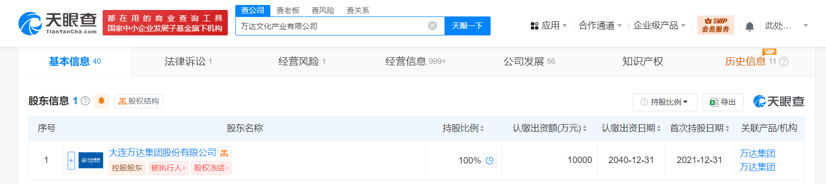 近日,大连万达集团股份有限公司新增一条股权冻结信息,股权被执行的企业为万达文化产业有限公司,冻结股权数额1亿人民币,冻结期限自2025年2月13日至2028年2月12日,执行法院为横琴粤澳深度合作区人民法院。