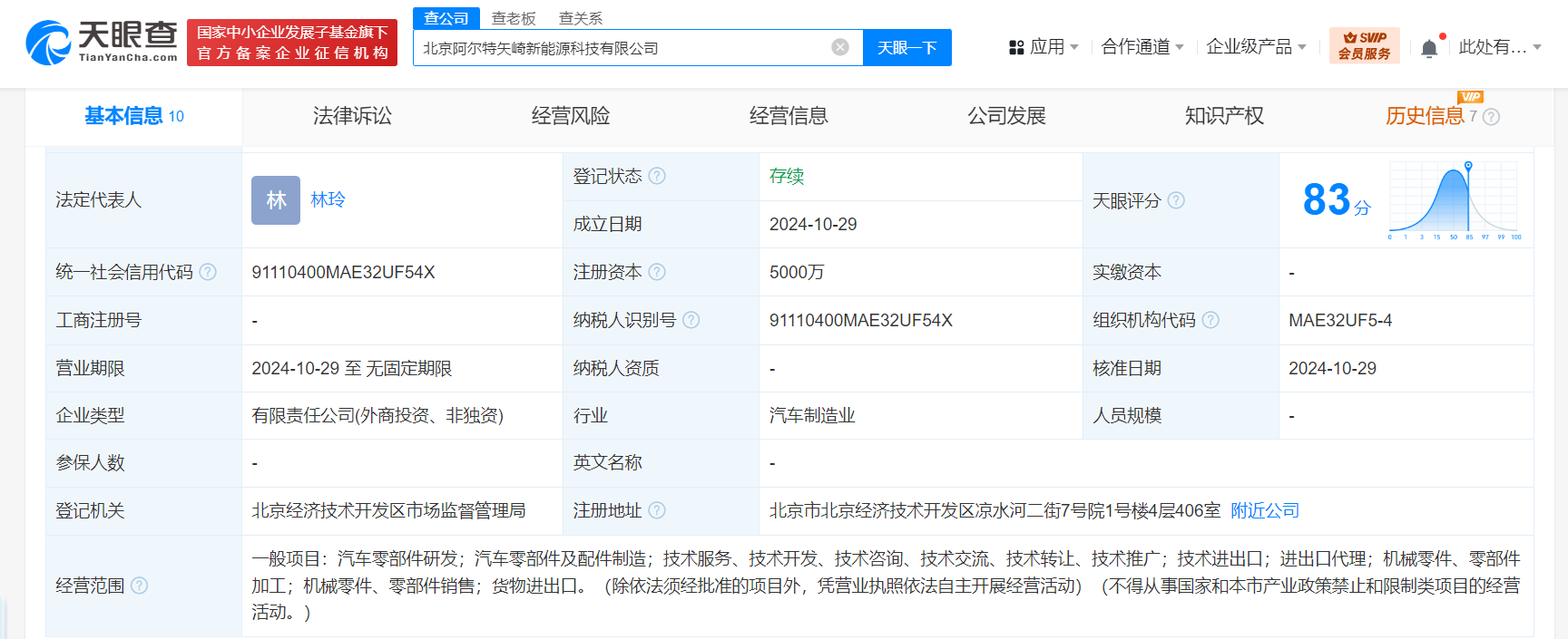 天眼查App显示,近日,北京阿尔特矢崎新能源科技有限公司成立,法定代表人为林玲,注册资本5000万人民币,经营范围含汽车零部件研发,汽车零部件及配件制造,机械零件、零部件加工,机械零件、零部件销售,货物进出口等。
