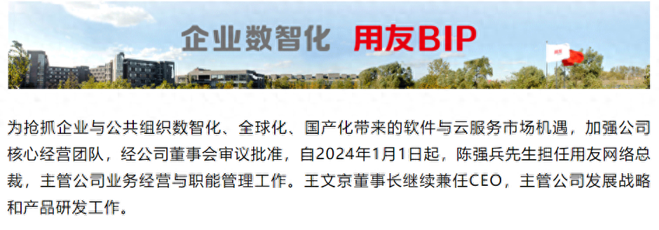 自2024年1月1日起,陈强兵先生担任用友网络总裁,主管公司业务经营与职能管理工作。王文京董事长继续兼任CEO,主管公司发展战略和产品研发工作。