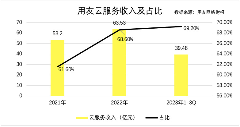 财报显示,2021年—2023年前三季度,用友云服务收入和占比持续上行。2023年前三季度,该业务板块收入39.48亿元,同比增长11.3%,营收占比69.2%。