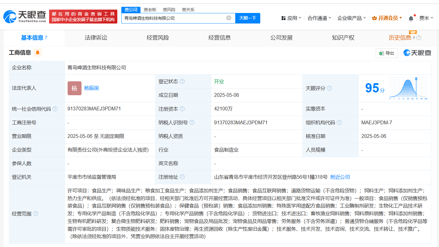 近日,青岛啤酒生物科技有限公司成立,法定代表人为杨振国,注册资本4.21亿人民币,经营范围包括食品生产、调味品生产、粮食加工食品生产、食品销售、道路货物运输、工业酶制剂研发等,由青岛啤酒(600600)全资持股。