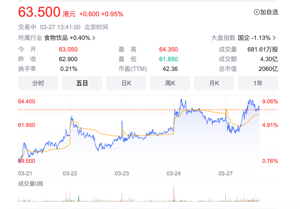 对此,市场的反馈很有意思。财报发布后,港股华润啤酒(00291)先是走高,股价来到64.4港元的高点,在经过25、26日的回落后,27日股价又涨到64港元附近。