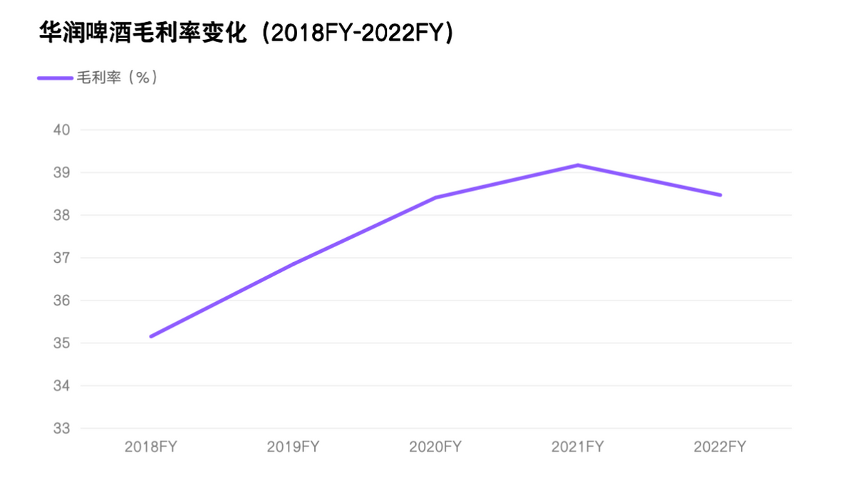 毛利率更能体现这一点,2022年华润啤酒的毛利率为38.46%,比2021年39%的毛利率,有所下降。
