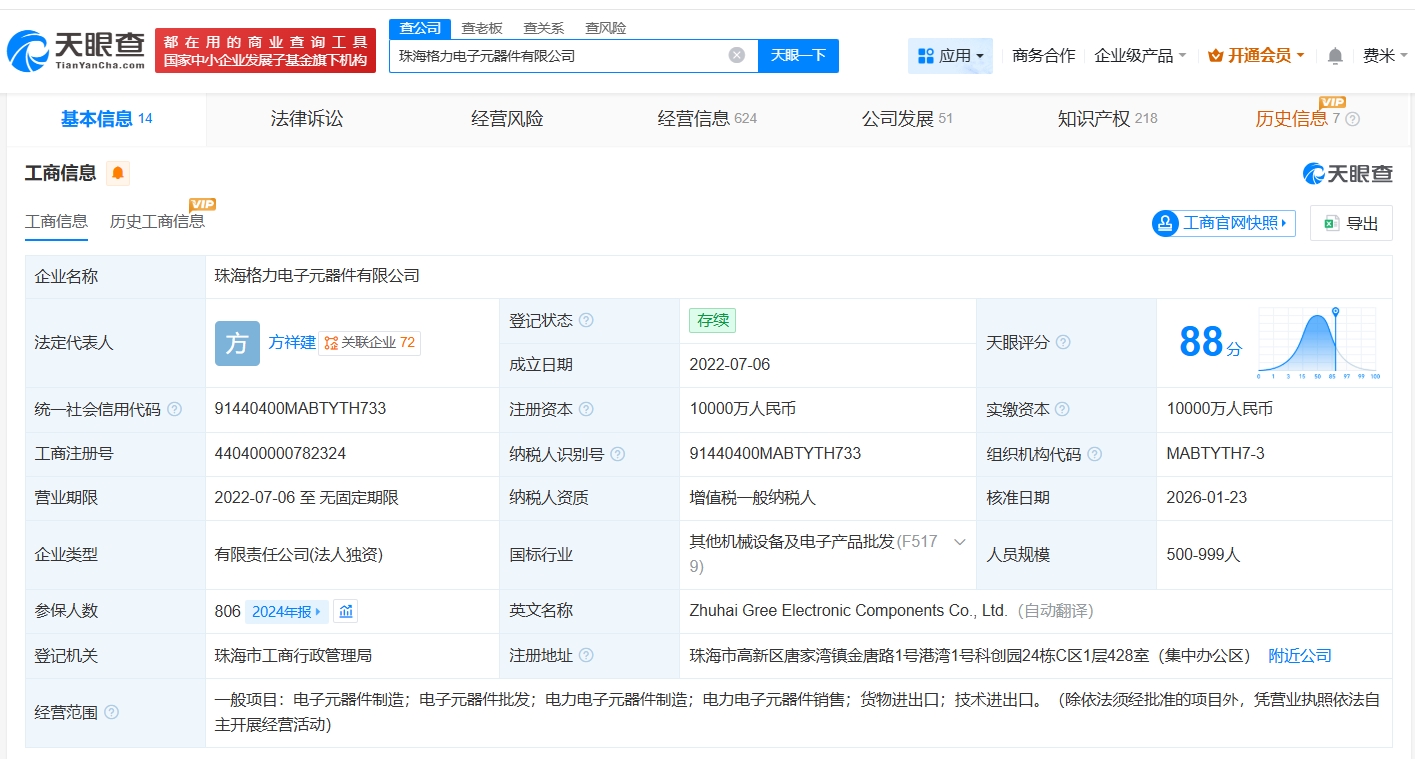 珠海格力电子元器件有限公司成立于2022年7月,注册资本1亿人民币,经营范围包括电子元器件制造、电子元器件批发、电力电子元器件制造等。股东信息显示,该公司由格力电器(000651)全资持股。
