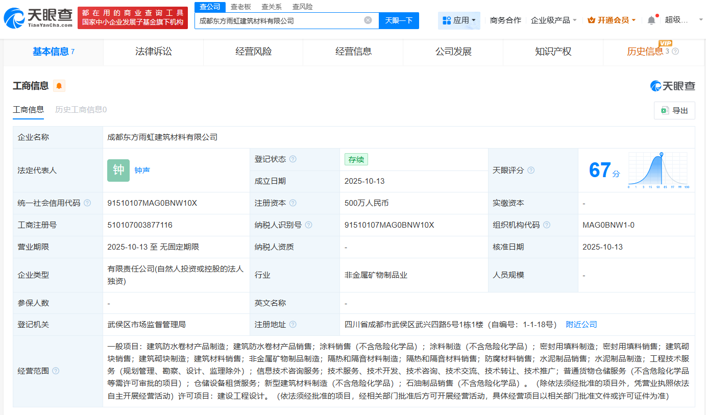 天眼查App显示,近日,成都东方雨虹建筑材料有限公司成立,法定代表人为钟声,注册资本500万人民币,经营范围包括建筑防水卷材产品制造、建筑防水卷材产品销售、涂料销售、建筑砌块制造等。