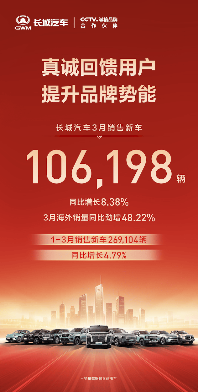 4月1日,长城汽车公布最新销量数据。2026年3月,长城汽车销售新车106198辆,同比增长8.38%。1-3月累计销售新车269104辆,同比增长4.79%。