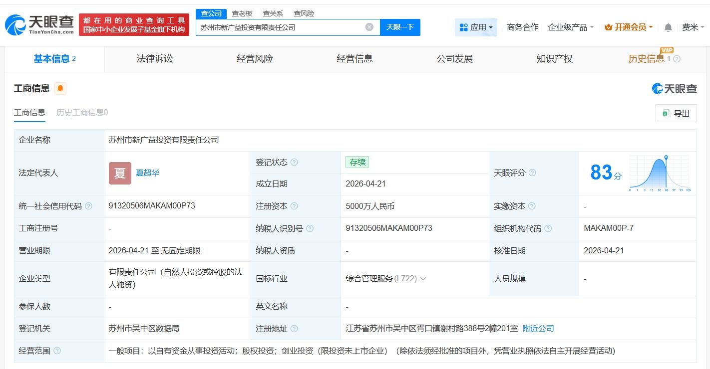天眼查App显示,近日,苏州市新广益投资有限责任公司成立,法定代表人为夏超华,注册资本5000万人民币,经营范围为以自有资金从事投资活动、股权投资、创业投资,由新广益(301687)全资持股。