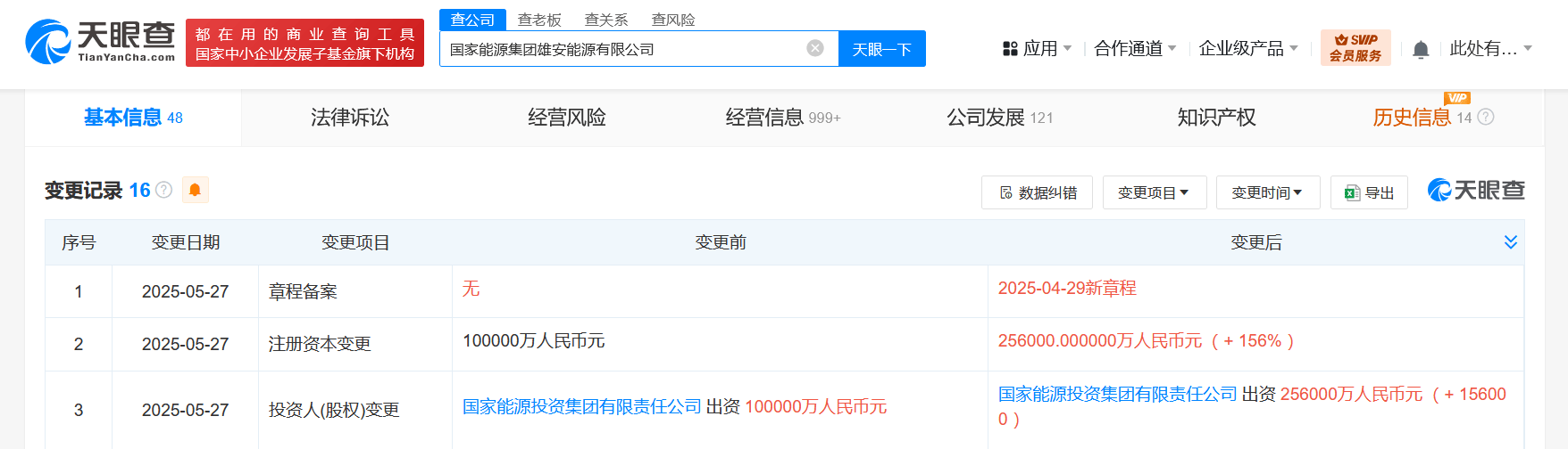 天眼查App显示,近日,国家能源集团雄安能源有限公司发生工商变更,注册资本由10亿人民币增至25.6亿人民币,增幅156%。